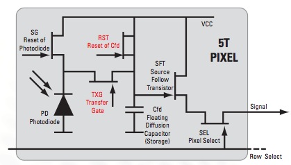 Los nuevos sensores de imagen Xensium-FT de Grass Valley, se basan en un diseño de píxeles 5T. El primero de los transistores adicionales (TXG o transistor de puerta de transferencia), se utiliza para controlar la transferencia de la carga de señal desde el fotodiodo dentro del condensador de difusión flotante.