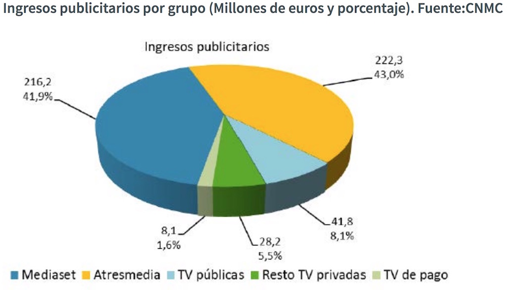 Los dos principales grupos de televisión, Mediaset y Atresmedia, representaron el 85% de los ingresos de publicidad en televisión.