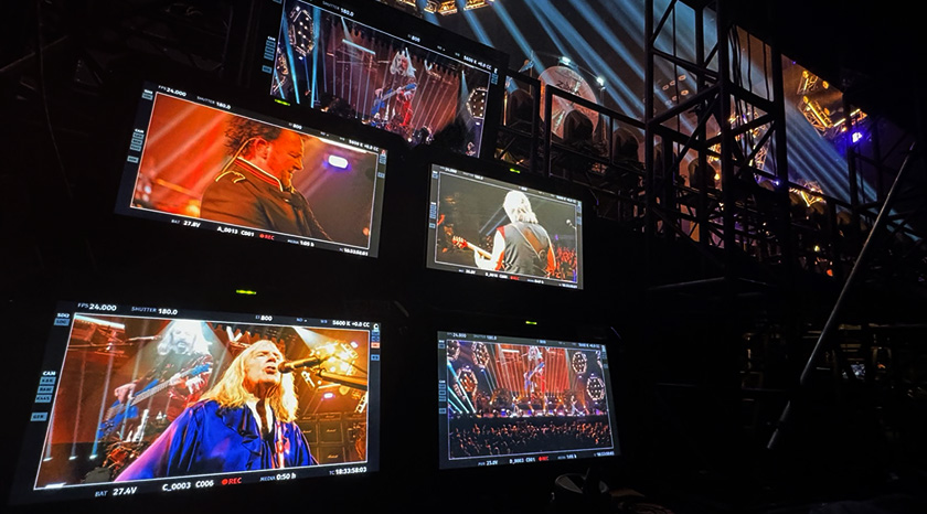 Para capturar este icónico concierto, el equipo de producción del largometraje decidió apostar por un flujo de trabajo que aunaría elementos cinematográficos y proAV controlado desde la unidad móvil. En el despliegue se utilizaron tres cámaras de transmisión digital Blackmagic URSA Broadcast G2 y dos Blackmagic Micro Studio Camera 4K G2, las cuales capturaron la actuación de la banda proyectada en los grandes monitores LED del escenario. Asimismo, se utilizó un mezclador de producción en directo ATEM Constellation 8K, un panel avanzado ATEM 2 M/E para cambiar las señales en directo de las cámaras Blackmagic Design, y se utilizaron decks de emisión HyperDeck Studio HD Pro para la grabación ISO. También se utilizó un iPhone con la aplicación Blackmagic Camera como cámara móvil libre.
