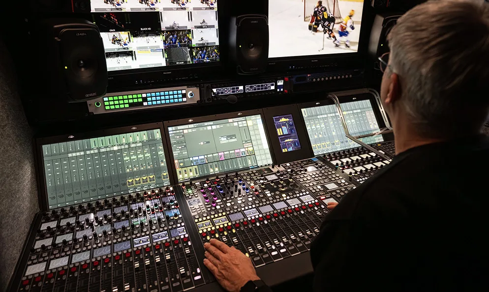 El entorno al aire libre planteó retos acústicos adicionales para el diseño de audio. Al no haber paredes de plexiglás detrás de las porterías, no se producían los reflejos típicos del hockey sobre hielo; además, el número de espectadores era impredecible. “Es muy diferente que haya 500 o 5000 personas alrededor de la pista. En algunos casos, los espectadores pueden estar incluso a solo un metro detrás de mis micrófonos de ambiente”, señala Maier. Para solucionar esto, el equipo implementó una configuración de micrófonos personalizada con equipos direccionales de cañón, lo que garantiza una captura precisa de la acción sobre el hielo y minimiza el ruido no deseado. “El ambiente se modela dinámicamente en los rangos de frecuencia relevantes para dejar espacio para el habla sin reducir el nivel general. Esta es un área en la que la última generación de consolas Lawo ofrece una flexibilidad creativa y técnica significativamente mayor”, explica.
