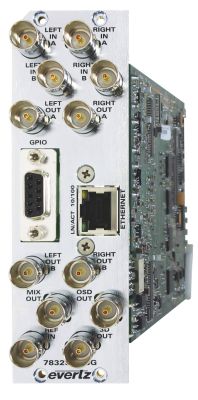 El módulo procesador de video estereoscópico 3D Evertz 7832SVP-3G está pensado para facilitar la producción y postproducción de vídeos 3D en alta definición. Cuenta con entradas para imagen derecha e izquierda y salidas procesadas y mezcladas.
