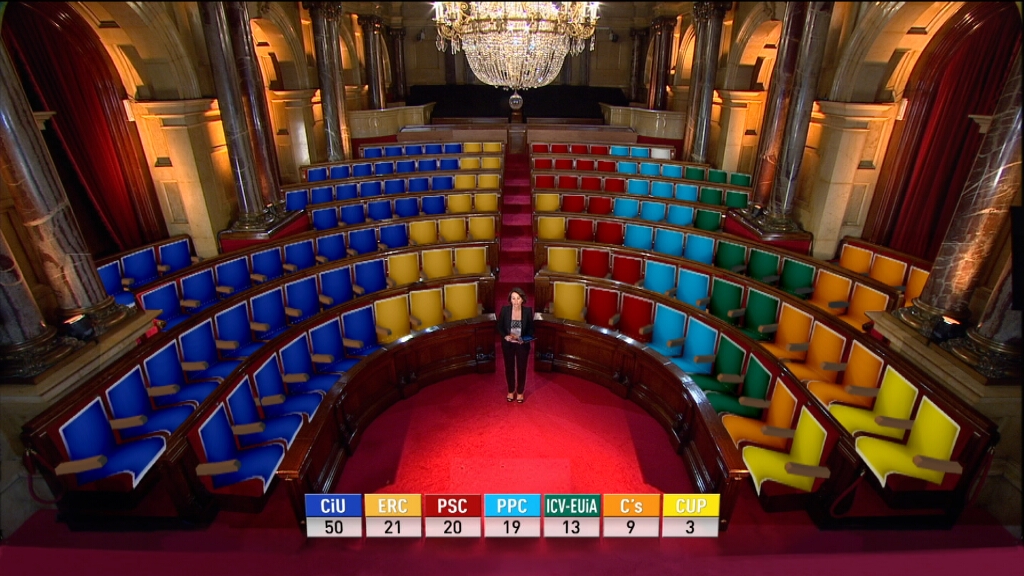 Por primera vez, el escrutino de una noche electoral se mostró a través de gráficos virtuales implementados en un espacio físico real. TV3 desglosó el reparto de escaños desde el mismo hemiciclo del Parlament, “pintando” de diferentes colores los asientos que ocuparán pronto los diputados, y añadiendo a una tecnología ya conocida la dificultad de hacer coincidir exactamente la imágen gráfica con los asientos correspondientes.