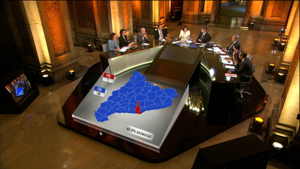 Estos gráficos de la composición del hemiciclo, dotados de movimiento de manera que permitiesen un efecto similar al de 3D y hechos por primera vez en alta defición, se complementaron a lo largo de la noche con muchos otros datos que, gracias a la misma tecnología, aparecían virtualmente en la Sala dels Passos Perduts, donde se instaló el set principal de la cadena. Desde allí, los espectadores pudieron seguir minuto a minuto los resultados a través de mapas de diferentes zonas del territorio, barras con los los porcentajes que ofrecía el escrutinio en cada demarcación y pantallas de conexión con líneas externas.