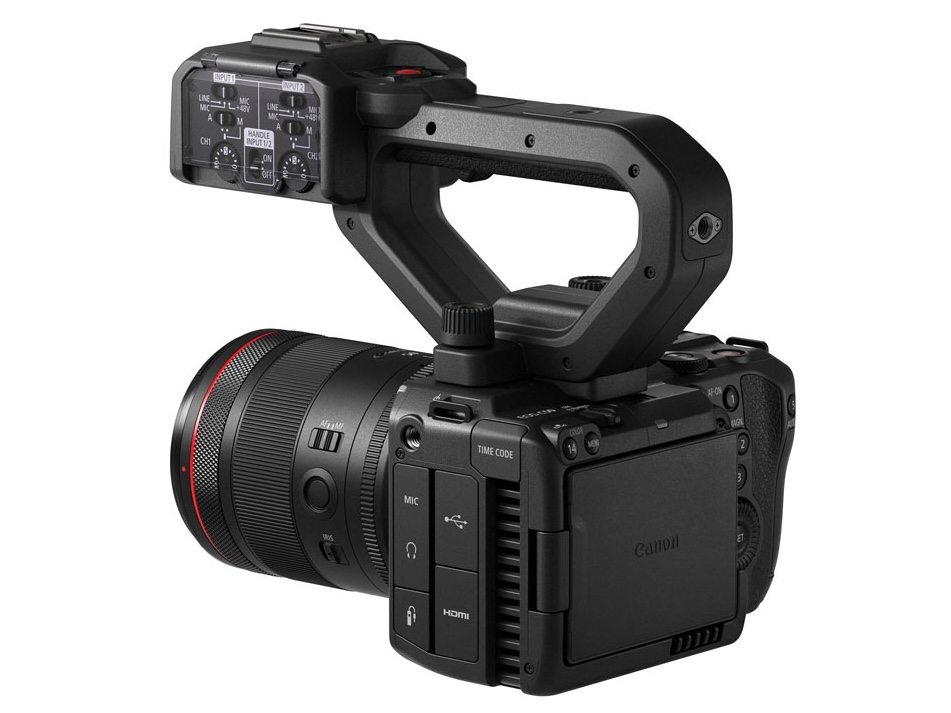 El asa desmontable de la EOS C50 mejora el control y la comodidad durante el manejo. Asimismo, cuenta con dos terminales de audio XLR de 3 pines de tamaño completo y diales de control para poder realizar grabaciones de audio de calidad profesional, además de un botón REC y un mando de balancín del zoom (con servo motorizado) al estilo de las cámaras de vídeo tradicionales. Además de la compatibilidad nativa con la amplia gama de objetivos RF, se pueden montar objetivos EF/PL en la EOS C50 mediante el adaptador PL-RF de Canon, que se puede acoplar adecuadamente al cuerpo de la cámara, además de poder usar una selección de los adaptadores de montura Canon EF-EOS R.