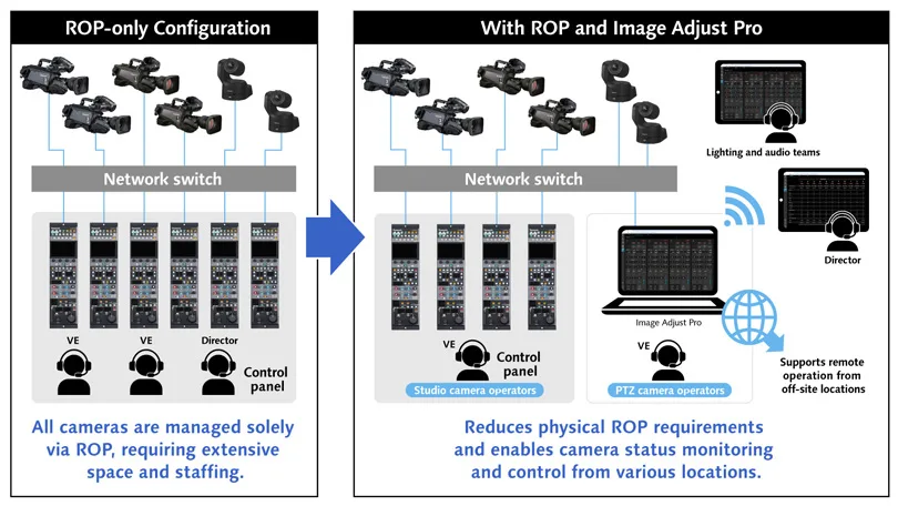 Las capacidades de ajuste de imagen son iguales a las del ROP de hardware AK-HRP1010, permitiendo configuraciones híbridas flexibles. De esta forma, las cámaras principales que se utilizan con frecuencia se pueden controlar a través de un ROP de hardware, mientras que otras unidades se manejan con el complemento, reduciendo el número necesario de ROP físicos sin sacrificar la precisión en el control de las imágenes. Además, en aquellos sistemas basados en IP, el complemento y los ROP de hardware pueden funcionar en paralelo.