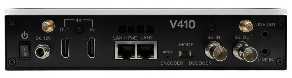 El V410, que ocupa poco espacio, mide 210 x 142 x 43,5 mm y se puede utilizar en un escritorio o en un rack. Además de la transmisión en directo, el contenido también se puede grabar en archivos en una tarjeta microSD o en una unidad USB externa.
