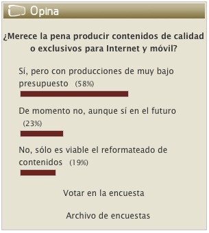 Según el sondeo propuesto por Panorama Audiovisual a sus lectores, más de la mitad de los profesionales (58%) considera que sólo es viable producir contenidos de calidad para nuevas plataformas como Internet o móvil siempre y cuando se trate de proyectos de muy bajo presupuesto. Un 23% de quienes han participado, sin valor estadístico, en la sección ‘Opina’ cree que de momento no, aunque sí en el futuro. Por su parte, dos de cada diez cree que no merece la pena apostar por la calidad en estas plataformas con contenidos exclusivos, siendo partidarios del reformateado de contenidos.