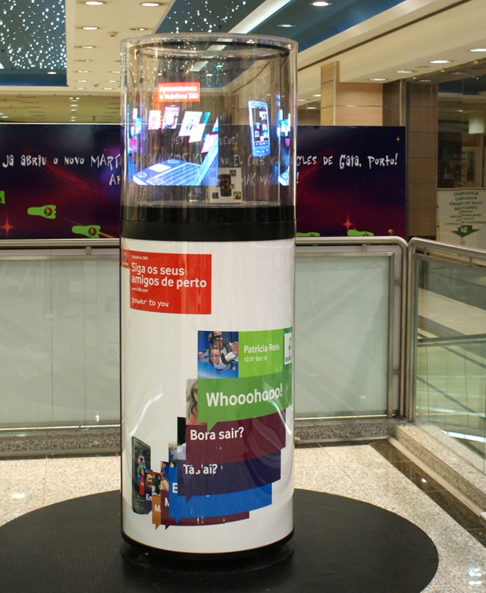Los Litefast Magic de Kinoton permiten proyectar imágenes circulares con transparencia siendo posible incluir dentro del cilindro objetos reales llamando poderosamente la atención de los usuarios. En el caso de esta campaña, Vodafone ha incluido algunos de sus terminales 360 dentro del display.