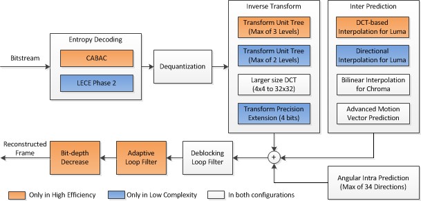 En el proyecto de este estándar se esta trabajando con una unidad de codificación que estaría basada en bloques de 8×8 a 64×64 en estructura de árbol con un tamaño de quadtree estructurado en bloques de 4×4 a 32×32. La intra predicción abarcaría hasta 34 direcciones de predicción intra con predicción avanzada de vectores de movimiento