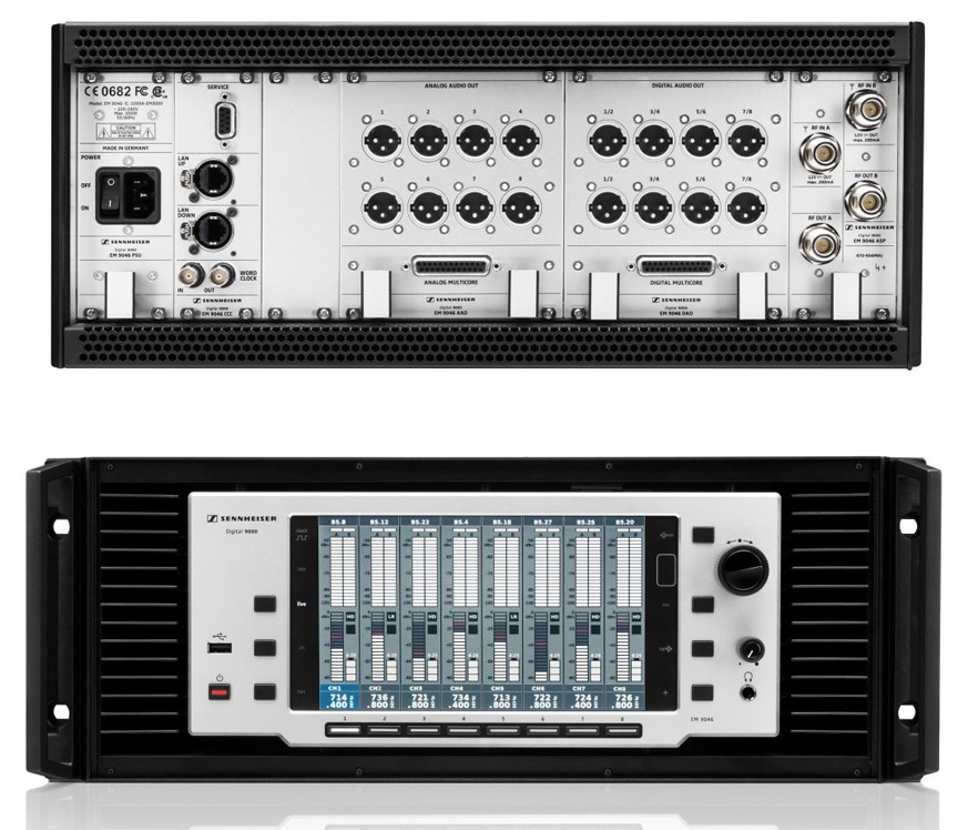 El receptor EM 9046 modular es un ordenador central con capacidad para ocho receptores internos. El sistema receptor cubre el rango UHF de 470 a 798 MHz (328 MHz de ancho de banda). Para integrar fácilmente el sistema en una infraestructura existente, el usuario puede elegir entre distintos módulos de salida: analógico balanceado por transformador, digital AES3 o incluso ambos.