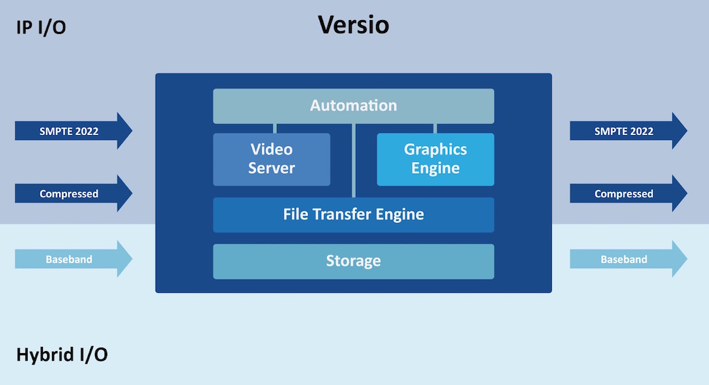 La instalación incluye 28 de los sistemas de reproducción Versio de Imagine. Versio incorpora servidor, gráficos, subtitulado y control maestro en un solo sistema, reduciendo la complejidad y minimizando los requerimientos de espacio. Un componente clave de la propuesta de transición transparente y sin interrupciones de Imagine es que Versio soporta simultáneamente contenido IP y SDI.