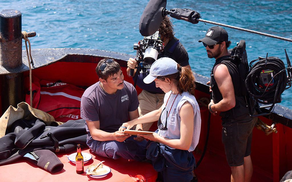 Esta indagación trajo consigo horas y horas de material de archivo: desde imágenes de referencia de este particular del mundo, hasta vídeos captados por el doble de Antonio de la Torre, buzo profesional. “Nos pasó todos los vídeos que tenía. Eran un montón. A raíz de eso pudimos tomar imágenes impactantes que acabaron en el film. Por ejemplo, el salto de los buzos entre dos barcos de noche son elementos que sacamos de su trabajo. Eran imágenes muy potentes que tenían cabida en la película”, recuerda Esteve.