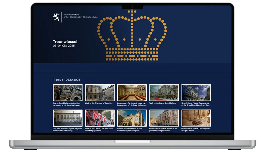 BCE estableció en el corazón de la capital, la Place Guillaume II, la Media House – Container City, una infraestructura que albergaba estudios temporales, puestos para reporteros y cabinas de traducción, con una vista directa del Palacio Gran Ducal. Desde esta posición, se produjo gran parte de los actos de coronación, los cuales se pudieron ver a través de la televisión lineal y del portal web oficial Trounwiessel, una solución impulsada por la plataforma Freecaster de BCE que ofreció transmisión en directo, acceso a VOD, una cuenta atrás y elementos gráficos integrados.