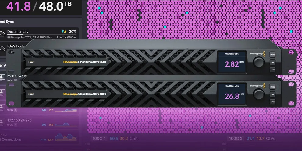 L'écosystème PI de Blackmagic Design crece desde el prisma del almacenamiento con el Blackmagic Cloud Store Ultra, un dispositivo de almacenamiento de gran rendimiento con una capacidad máxima de 48 TB oui dos puertos Ethernet 100G que permiten al usuario grabar y editar simultáneamente sin que ninguna de estas dinámicas de trabajo interfiera con la otra. Disponible en modelos de 24 y 48 TB, ofrece compatibilidad con sistemas RAID 5, dos fuentes de alimentación redundantes y sincronización con Blackmagic Cloud.