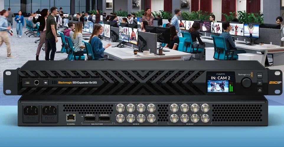 Le nouveau Blackmagic SDI Expander 8x12G permite conectar todos los equipos SDI 12G a un sistema IP SMPTE 2110 a través de una red Ethernet 10G. Este conversor ofrece ocho conexiones SDI 12G bidireccionales y dispone de dos puertos Ethernet 100G independientes, para trabajar con un sistema SMPTE 2022-7 con redundancia.