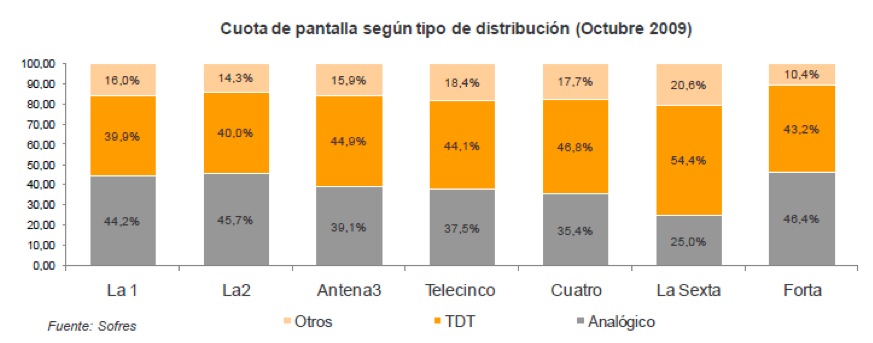 La Sexta es la cadena con mayor audiencia en TDT y en octubre ha conseguido que su audiencia a través de la TDT (54,4%) duplique a la analógica (25%). En segundo lugar, se sitúa Cuatro, la otra cadena generalista joven, con una cuota de pantalla en TDT de casi el 47% frente a un consumo en analógico del 35,4%. Antena 3 y Telecinco cuentan con un consumo procedente del mando digital superior al 44% en ambos casos, dejando su share analógico por debajo del 40%. Los espectadores digitales también figuran cada vez más entre los canales públicos ‘tradicionales’: la Forta y La 2 han visto cómo sus audiencias digitales han crecido de septiembre a octubre casi 3 puntos y La 1 consigue un avance mensual de 2,3 puntos.