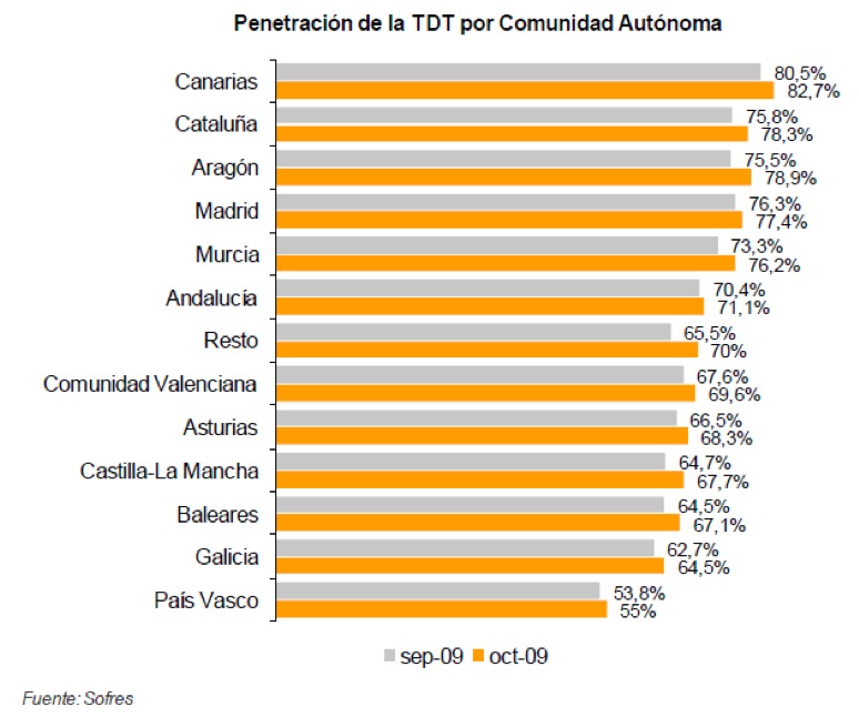 La información facilitada por TNS para el mes de octubre señala que la TDT está instalada y operativa en el 72,1% de los hogares españoles. Esa cifra es superior en 2,1 puntos a la registrada en el mes anterior y consolida un crecimiento de 28,4 puntos porcentuales en lo que va de año 2009.