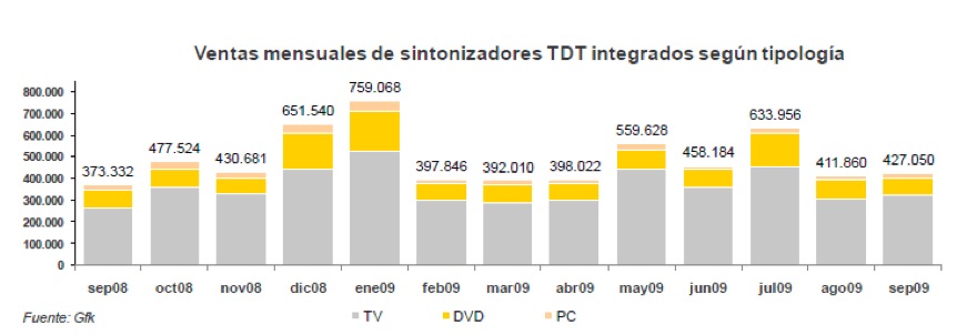 En el mes de septiembre se vendieron prácticamente 690.000 sintonizadores de TDT, un 2,3% más que en agosto. Por consiguiente, y según los datos del panel detallista de GfK, la cifra acumulada de ventas se sitúa cerca de los 22,5 millones de equipos vendidos, de los cuales el 32,2% -unos 7,2 millones de terminales- han sido comercializados a lo largo de 2009. Con esa cifra se supera en sólo nueve meses, el acumulado anual de 2008, que se situó en 7,1 millones de equipos.