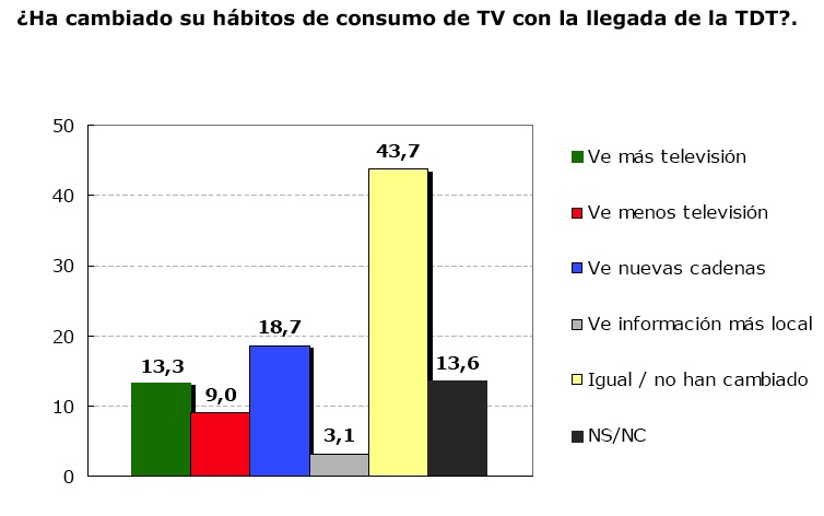 Con la llegada de la TDT, se amplía sustancialmente la disponibilidad de canales en el hogar y con ello, se presupone el primer cambio en los hábitos de consumo de la televisión. Así, un 18,7% de los encuestados asegura ver nuevas cadenas, un 13,3% ve más televisión y, sin embargo, un 9% lo hace menos. Un porcentaje del 43,7% afirma no haber cambiado sus hábitos de consumo; continúan viendo los mismos canales y destinan el mismo tiempo a su ocio televisivo.