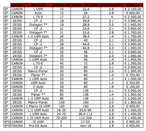 El realizador Rodrigo de la Calle, experto en cinematografía digital publicaba recientemente en su blog una tabla de ópticas EF(-S) recomendadas para grabación en vídeo, llevando a cabo una comparativa interesante entre ópticas de foto y ópticas de cine recomendadas para rodar con las Canon 5D, 7D y 550D sin tener que modificar la cámara para ópticas PL.