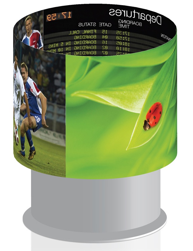La pantalla de 360° de este nuevo modelo se divide en tres pantallas de 120°, mostrando cada una un contenido diferente. Así, por ejemplo, mientras que un tercio de esta popular pantalla circular en LED muestra anuncios, trailers de películas o videos musicales, los otros dos pueden presentar cualquier imagen fija como carteles digitales, información de vuelos, horarios o banners comerciales. Precisamente, la posibilidad de vender espacios publicitarios, junto a contenido audiovisual, es ahora una de las posibilidades más atractivas de esta pantalla circular.
