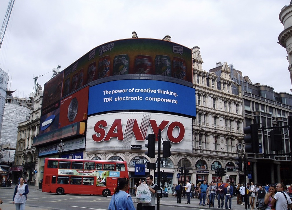 Piccadilly Circus es una pieza central de la bulliciosa del West End de Londres. Entre otras cosas, es conocido por sus grandes carteles, anuncios espectaculares en la esquina noroeste entre Regent Street y la avenida Shaftesbury. En el pasado reciente la mayoría de estas vallas era de neón, pero estos han sido reemplazados gradualmente con pantallas LED en la última década.