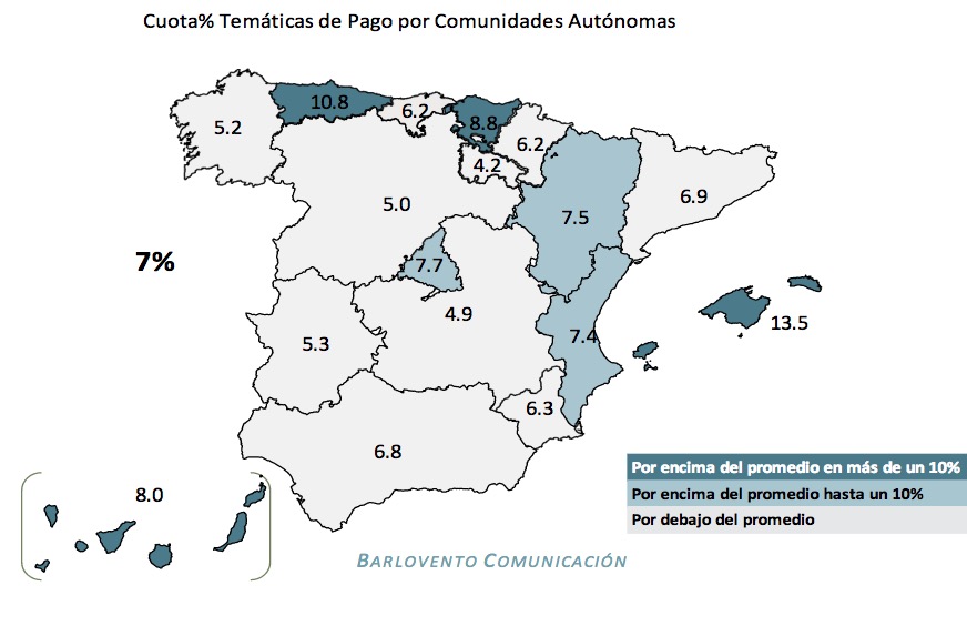 Los resultados de las Temáticas de Pago destacan en las Comunidades Autónomas de Baleares (13,5% cuota TTV), donde es la opción líder, en Asturias (10,8%), en País Vasco (8,8%) y en Canarias (8%).