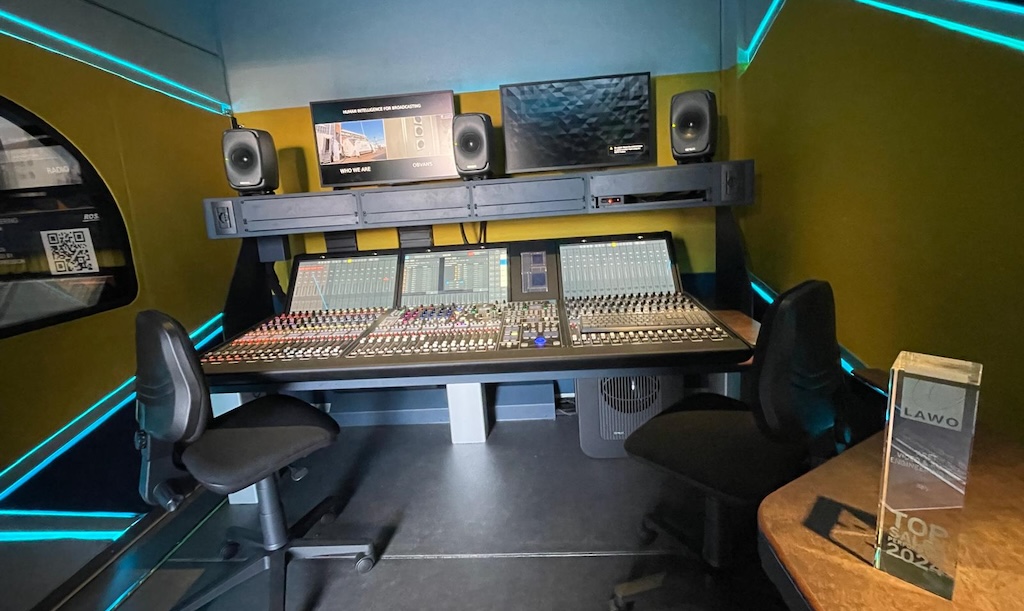 Los sistemas de audio y control nativos IP de Lawo constituyen la columna vertebral técnica de este vehículo de producción de alta gama. La sala de control de audio se centra en una consola de producción de audio mc²56 de 64 faders, una superficie de mezcla de primer nivel diseñada para un funcionamiento ágil en entornos complejos. Con soporte nativo completo para SMPTE ST 2110, AES67/RAVENNA, MADI y Dante, la mc²56 ofrece la máxima flexibilidad de formatos. La consola está impulsada por motores A__UHD Core redundantes, cada uno de los cuales ofrece 1024 canales DSP totalmente procesados, latencia ultrabaja y compatibilidad total con flujos de trabajo de audio inmersivo como Dolby Atmos, lo que prepara el sistema para las futuras exigencias de producción.