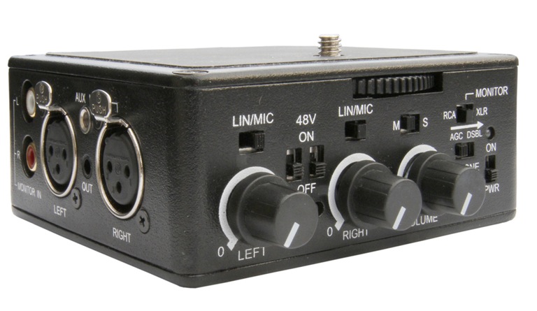 El modelo DXA/SLR es un adaptador activo XLR de audio para cámaras DSLR con mini jack, con preamplificador silencioso y alimentación phantom. Se acopla a la base de la cámara con un macho de ¼” y a la vez éste se puede montar en un plato de cámara también con rosca ¼”. Su tamaño permite cambiar la batería sin tener que desmontar en adaptador. La carcasa es de fundición de aluminio y tiene indicador de grabación, función AGC de ganancia, volumen de auriculares, selector salida mono/estéreo, selectores línea/micrófono, balance de canales, selectores de alimentación phantom, indicadores de activo y picos, dos entradas XLR balanceadas, entrada auxiliar mini jack para micrófonos inalámbricos, salida mini jack a cámara, entradas RCA para monitorización y ajustes de ganancia HI/LO.