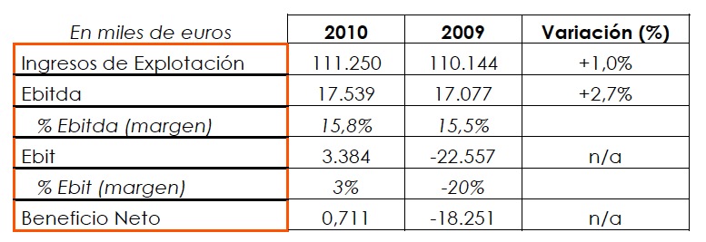 El efectivo desarrollo de los planes diseñados para la mejora de la eficiencia de sus operaciones, las ventajas competitivas que surgen de la prestación de servicios integrales y la positiva aceptación de los contenidos elaborados por Vértice 360º han permitido a la compañía superar el umbral de la rentabilidad tanto en Ebitda como en Ebit. Así, el Grupo ha cerrado el año con un Ebitda (beneficio antes de intereses, impuestos, amortizaciones y depreciaciones) de 17,5 millones de euros, un 2,7% más que en 2009. Aún más importante es la recuperación en términos de Ebit. La empresa alcanza la cifra de 3,4 millones de euros, cuando doce meses antes registraba unos números rojos de -22,6 millones de euros.