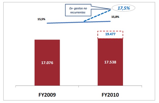 Estas magnitudes incluyen los gastos extraordinarios en que se ha incurrido en 2010 y que vienen motivados principalmente por la operación de integración del Grupo Lavinia, que culminó a finales del cuarto trimestre. El total de extraordinarios asciende a 1,9 millones de euros. Excluyendo estos gastos extraordinarios, los márgenes mejoran sustancialmente al alcanzar un Ebitda de 19,5 millones, que correspondería a un 17,5% sobre ingresos (ex gastos extraordinarios).