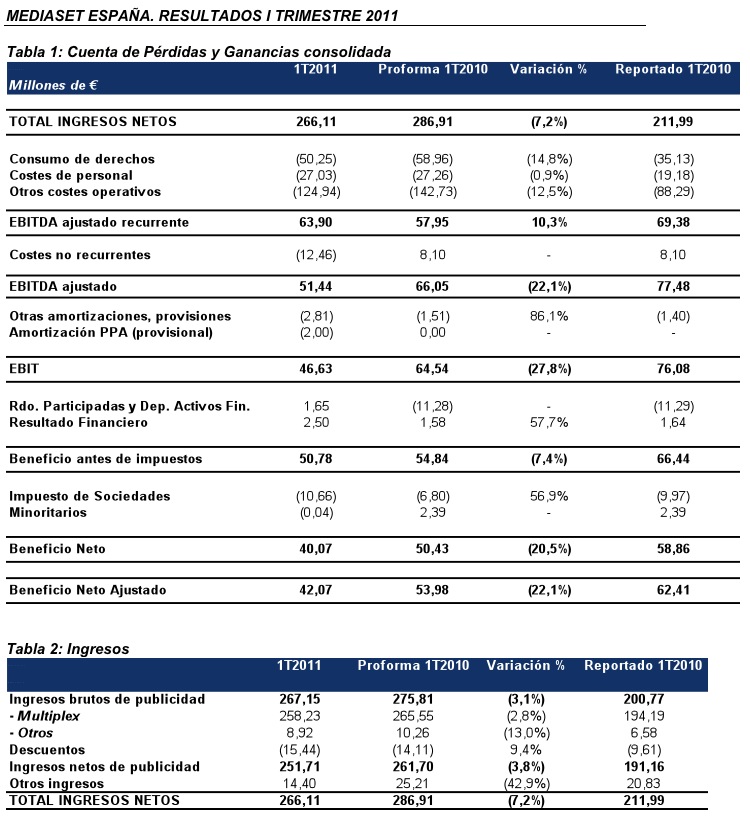 Esta disminución se deduce de la comparativa con los costes pro-forma de los resultados financieros consolidados de Telecinco y Sogecuatro correspondientes al primer trimestre de 2010, y tras aislar el impacto de los costes no recurrentes de reestructuración de personal (12,46 millones de euros), de la reversión de una provisión en el primer trimestre de 2010 y el impacto de la amortización de intangibles en dicho periodo.