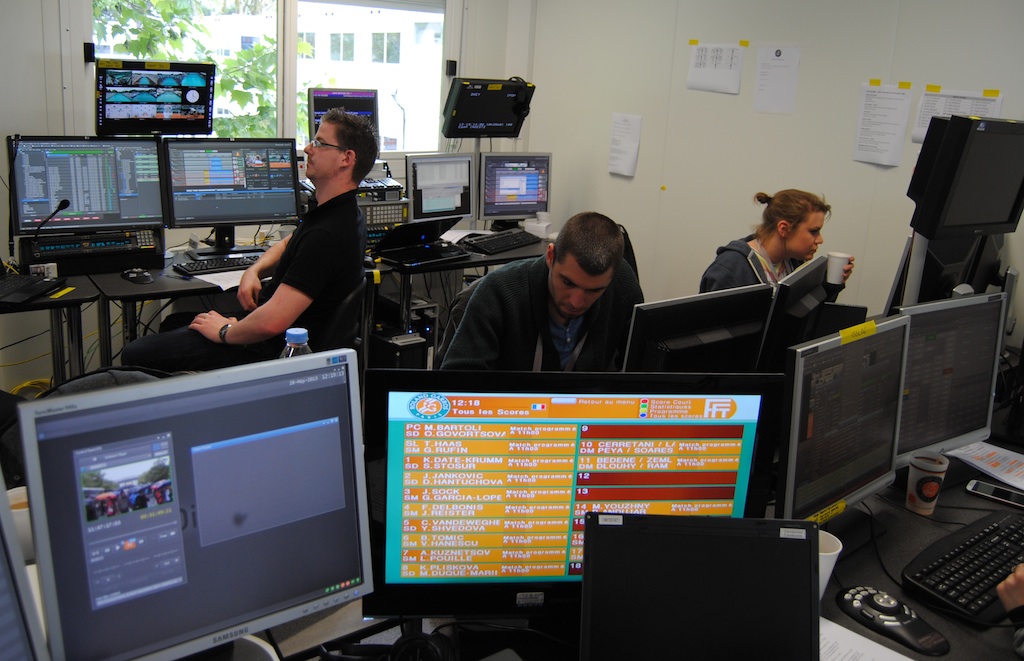 Para producir la señal internacional FTV ha desplegado 4 unidades móviles con diferentes configuraciones. El recinto más grande, Philippe Chatrier, está cubierta con 14 puestos de cámara que se ingestan directamente en cuatro servidores EVS XT en una configuración de 4 entradas/2 salidas. Por otro lado, las nueve señales procedentes de la segunda cancha, Suzanne Lenglen, se dirigen a tres servidores XT de 6 canales. Cada una de estas móviles tiene un dispositivo Xstore con discos removibles para almacenar la señal de programa limpia durante todo la duración del torneo. Todos estos servidores se controlan directamente desde los paneles de control remoto LSM agilizando la confección de destacados y repeticiones a cámara lenta de las mejores jugadas.