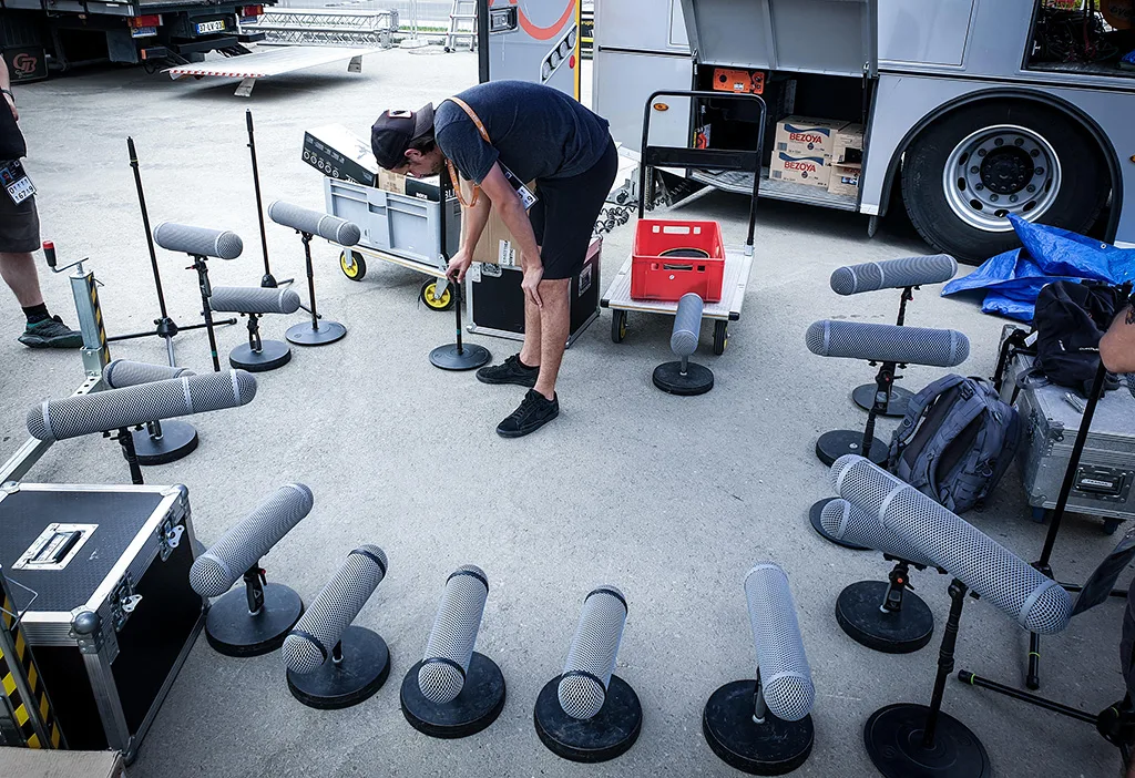 Una vez emplazados los micrófonos, el ingeniero de sonido resuelve el transporte situando una caja de escenario en la banda izquierda del estadio para capturar las señales analógicas de cada uno de los dispositivos, de modo que estas recorren un total de entre 100 y 150 metros: “Así tenemos mucha menos pérdida”. A continuación, la señal se transporta a la unidad móvil vía fibra óptica。