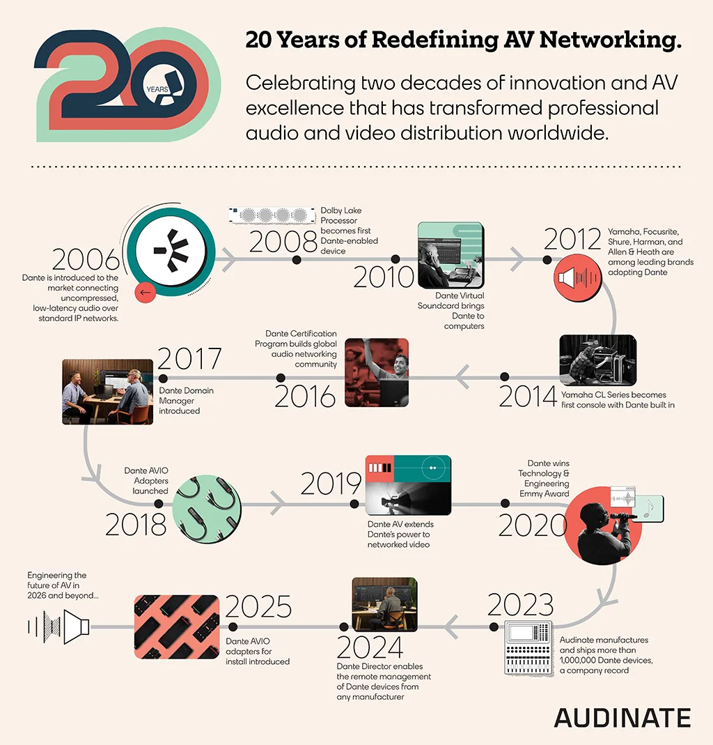 En palabras de Aidan Williams, director ejecutivo de Audinate: “Hace veinte años, Dante no solo resolvió un reto técnico. Redefinió lo que era posible para el AV. Lo que comenzó como una forma mejor de transmitir audio de alta calidad de forma fiable y sencilla a través de IP se ha convertido en una plataforma que sustenta los sistemas AV actuales. Este hito valida nuestra visión, la colaboración sostenida de nuestros socios y la profundidad y el compromiso de la comunidad global de Dante”.